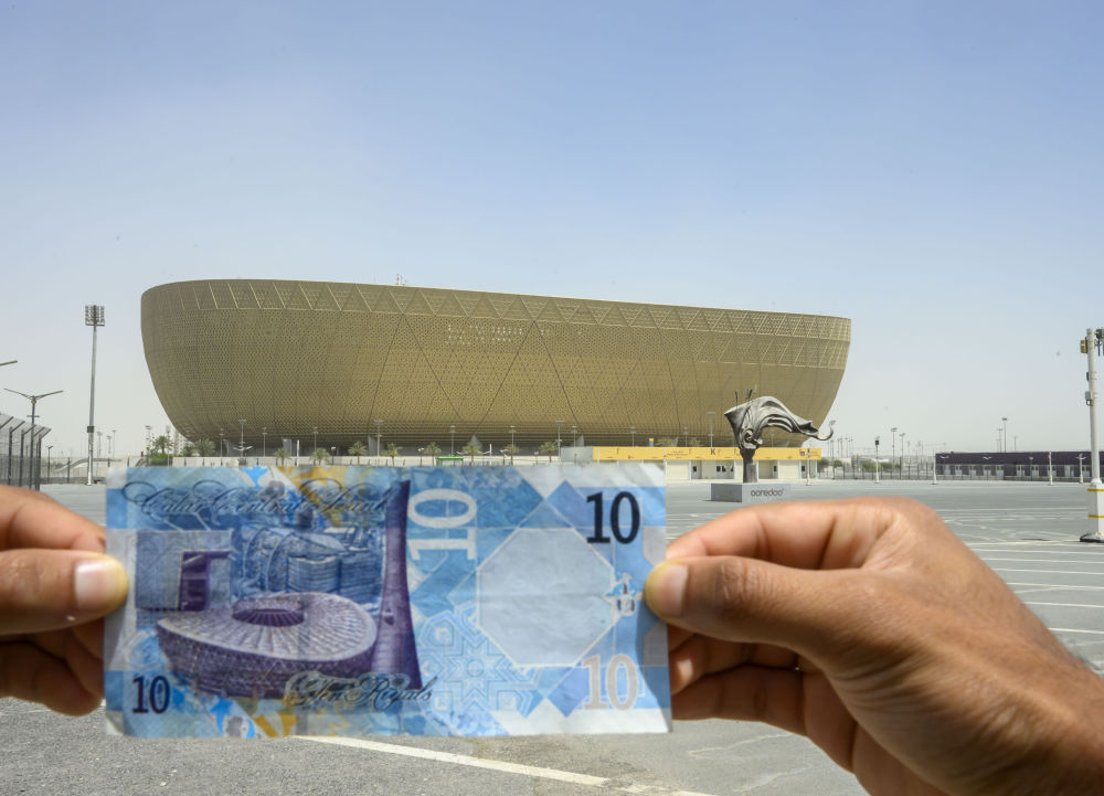这是2025年4月17日在卡塔尔首都多哈以卢赛尔体育场为背景拍摄的卡塔尔10里亚尔纸币,纸币左边图案为卢赛尔体育场。