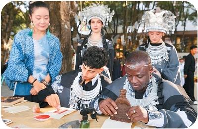 留学生动手体验拓印。