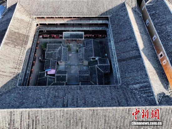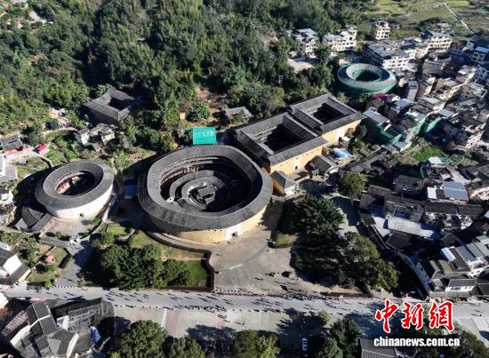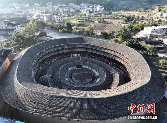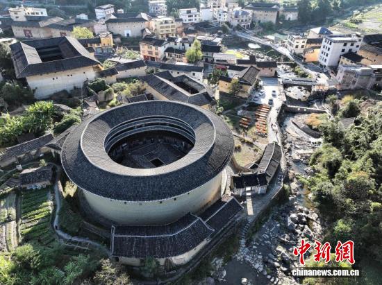 11月23日,航拍“福建土楼王”承启楼。福建永定是著名的土楼之乡,永定土楼在中国传统民居建筑中独树一帜,是客家人在辗转迁徙中,发扬古老生土建筑技术创造的世界建筑奇迹,被誉为“东方古城堡”。承启楼直径达73米,全楼共四圈,有400多个房间。作为福建土楼中规模最大、环数最多的一座,承启楼素有“福建土楼王”的美誉,其造型独特、建筑工艺精湛、建筑质量过硬,在当地现存的两万三千多座土楼中独领风骚。2008年7月,承启楼等福建土楼的重要代表被列入《世界遗产名录》。