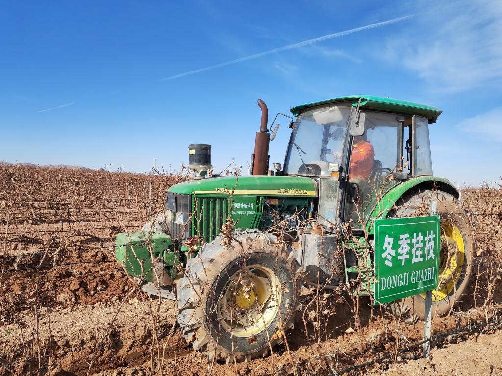 11月19日,在位于贺兰山东麓青铜峡产区的西班酒庄葡萄种植基地,工作人员驾驶农机进行翻土作业。新华社记者 刘海 摄