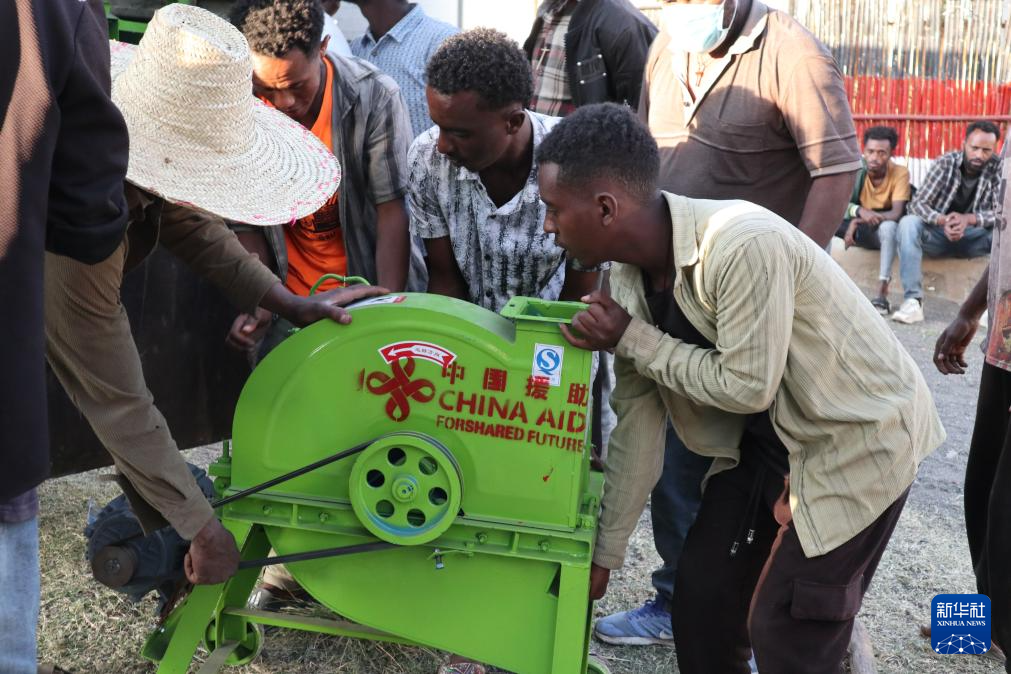 11月26日,在埃塞俄比亚奥罗米亚州比绍夫图市戈迪诺村,当地村民在搬运中国捐赠的农业设备。新华社记者刘方强摄