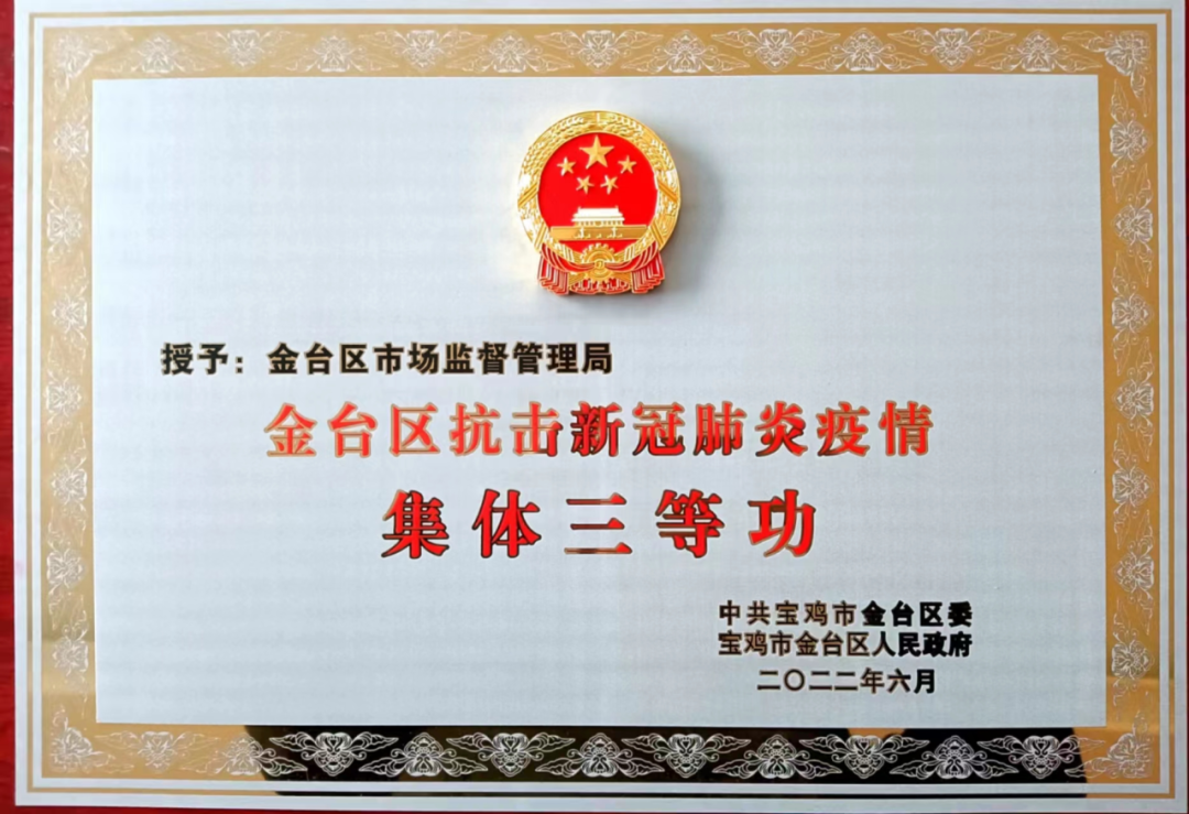 疫情大考面前,金台区市监人无畏逆行。20万余户次的市场主体检查,245个风险场所的果断封控,近500万份核酸采样的组织配合,300余家门店的关停整改……他们用脚步丈量责任,用行动守护安康。因表现卓越,被区委区政府授予“集体三等功”,这份荣誉,沉甸甸,光灿灿。