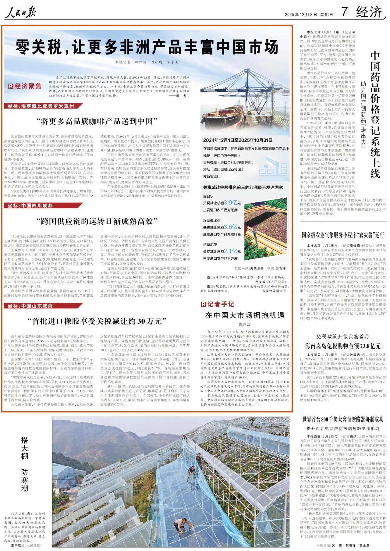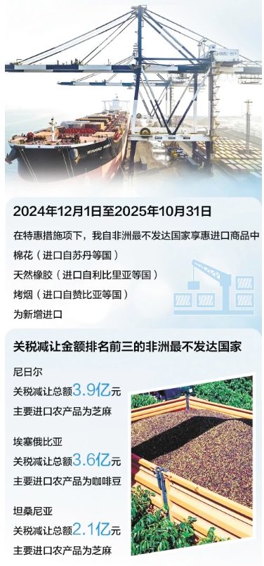 为扩大对最不发达国家单边开放,实现共同发展,自2024年12月1日起,中国对原产于同中国建交的最不发达国家100%税目产品适用税率为零的特惠税率。其中,关税配额产品将配额内关税税率降为零,配额外关税税率不变。一年来,中非互惠合作持续推进,贸易活力不断迸发。近日,记者分别走进非洲的种植基地、中国的贸易企业及生产制造企业,观察零关税政策如何带动非洲相关产业发展、丰富中国消费者的选择。