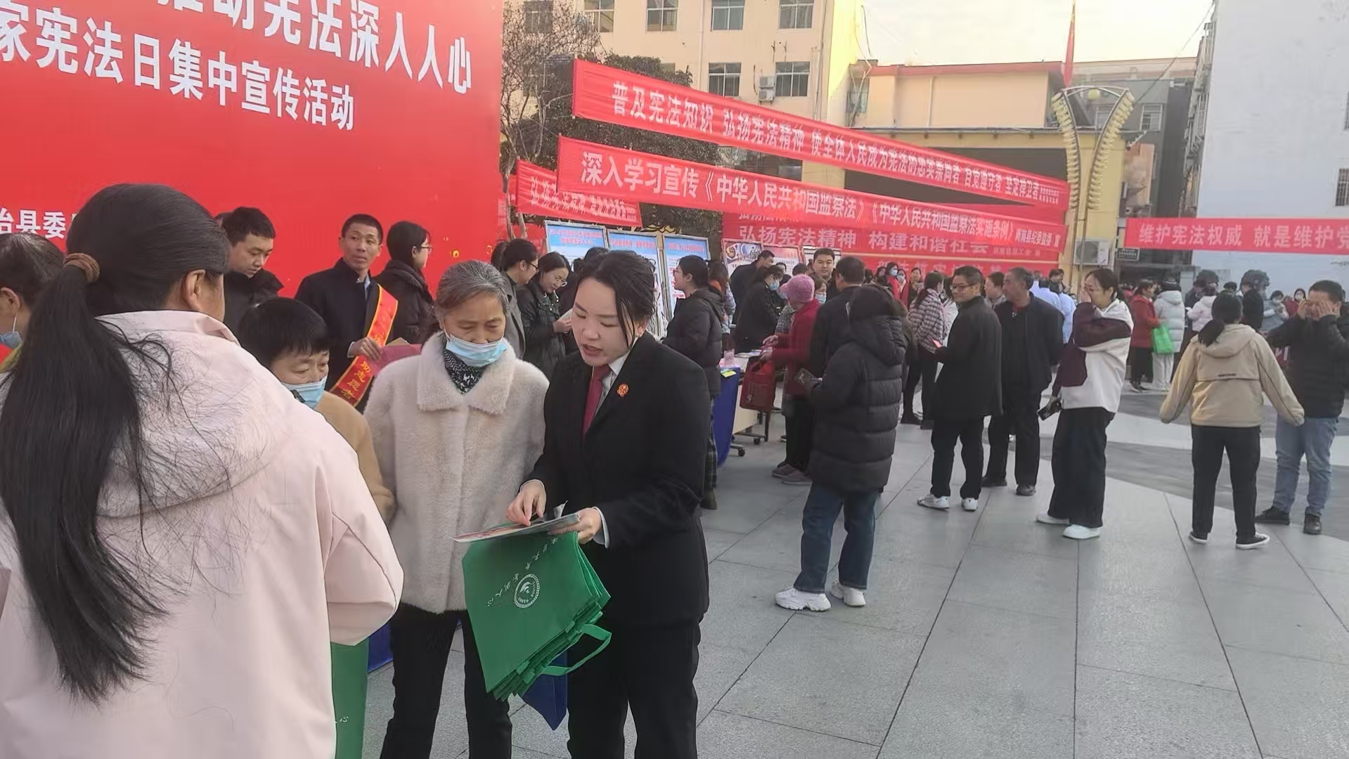 清晨的商南县政府广场,红色横幅迎风招展,法治展板整齐排列。民事审判庭、刑事审判庭、立案庭的干警们早早搭起讲台,将《中华人民共和国宪法》读本、法治宣传手册等资料整齐摆放。“宪法不是冰冷的条文,而是守护大家合法权益的‘权利保障书’。”干警们用通俗易懂的方言,结合婚姻家庭、邻里纠纷等典型案例,向过往群众解读《中华人民共和国宪法》的规定、原则及精神,重点宣讲习近平法治思想和党的二十届四中全会关于法治建设的部署要求。