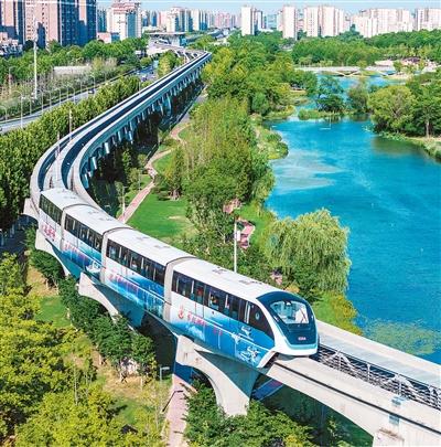 近年来,安徽省芜湖市通过轨道交通与公交、慢行系统的深度融合,助力市民高效便捷出行,推动城市功能升级与低碳转型。图为无人驾驶单轨列车行驶在轨道上。