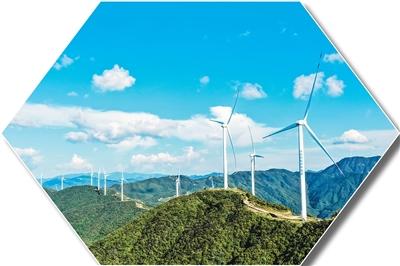 湖南省永州市蓝山县十里冲风电场,一台台风电机组耸立在连绵的青山之上。