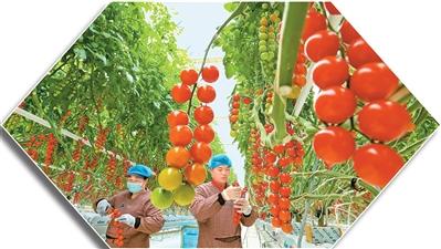 甘肃省张掖市甘州区采用先进农业技术,建成10多万平方米现代农业智能温室工业化蔬菜栽培车间。图为甘州区三和智慧农业产业园蔬菜栽培车间里,工人在采摘成熟的“串番茄”。