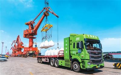 在江苏省张家港港务集团码头,一辆氢能重卡正在进行装运作业。据了解,该类氢能重卡在散货运输、大宗货物干线运输等多元场景中展现出强劲的绿色动能,为物流低碳转型注入“氢”动力。