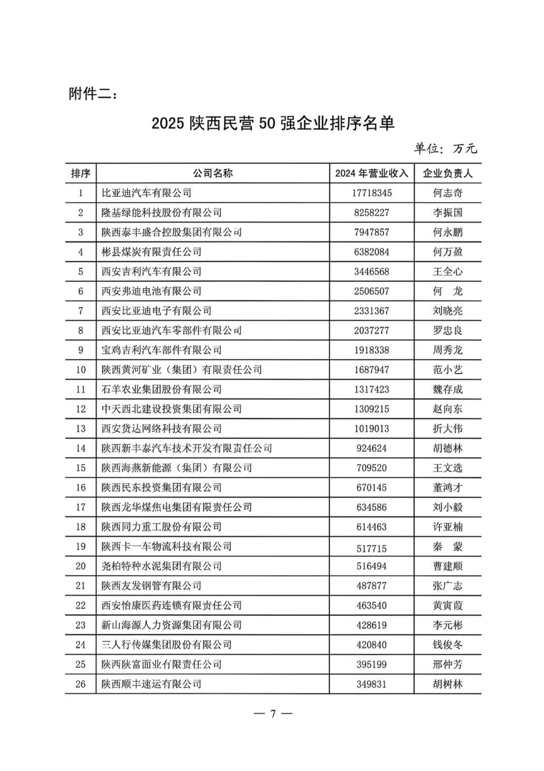 12月9日,记者从陕西省企业家协会获悉,2025陕西100强企业和陕西民营50强企业排序于当日发布。陕西煤业化工集团有限公司、陕西延长石油(集团)有限公司、陕西建工控股集团有限公司、比亚迪汽车有限公司、陕西有色金属控股集团有限责任公司居陕西100强企业前五位;比亚迪汽车有限公司、隆基绿能科技股份有限公司、陕西泰丰盛合控股集团有限公司、彬县煤炭有限责任公司、西安吉利汽车有限公司居陕西民营50强企业前五位。