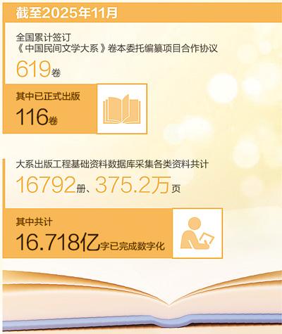 截至2025年11月,全国累计签订《中国民间文学大系》卷本委托编纂项目合作协议619卷,其中已正式出版116卷。通过建立科学的编纂体系,大系出版工程将散落的民间记忆转变为文本文献,实现民间文学系统著录,更好地赓续中华文脉。