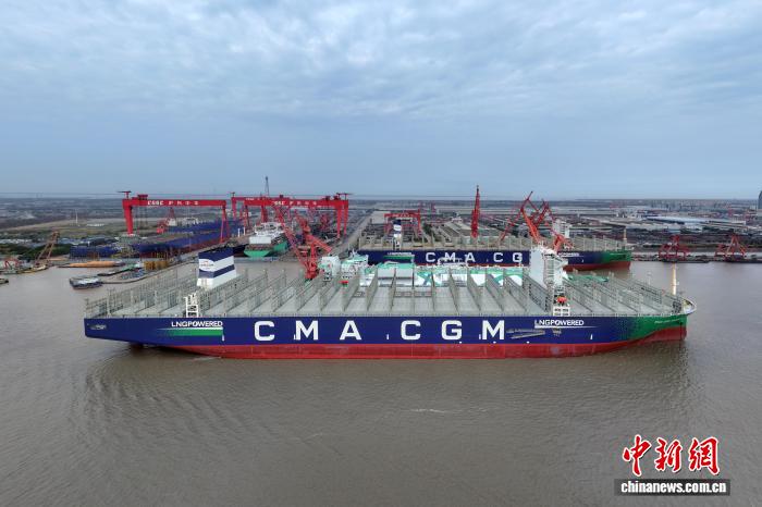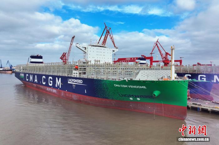 中新网上海12月12日电 (李秋莹 张文豪)12月12日,中国船舶集团旗下沪东中华造船(集团)有限公司(以下简称沪东中华)为法国达飞海运集团建造的全球最大24000TEU级LNG双燃料集装箱船“达飞旺多姆”号提前8个半月命名交付,这也是沪东中华建成交付的第100艘集装箱船,彰显了中国在全球造船领域的主导地位。