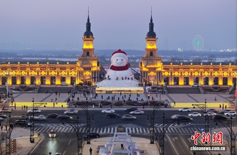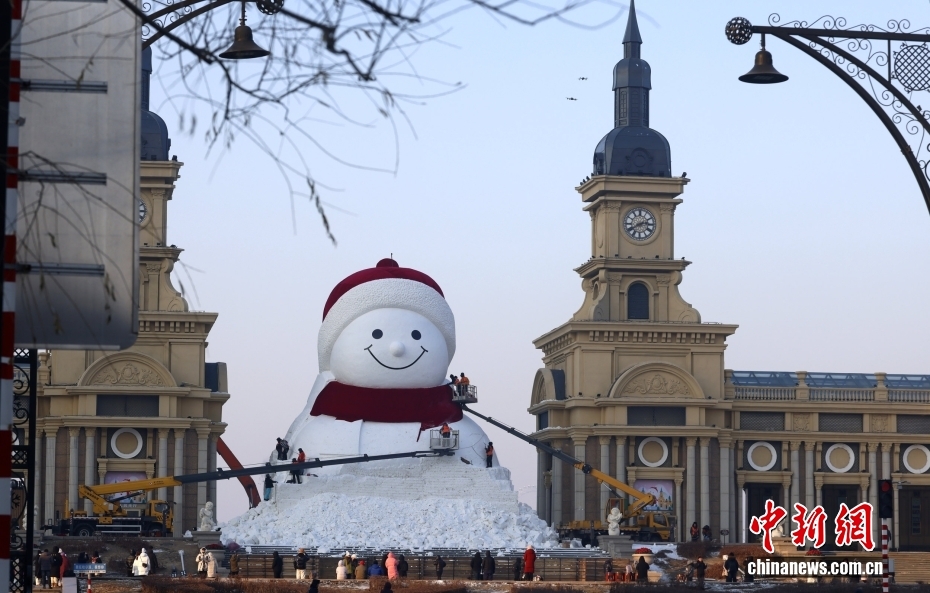 12月14日,黑龙江省哈尔滨市,音乐公园音乐长廊下,备受瞩目的网红大雪人景观已接近完工。
