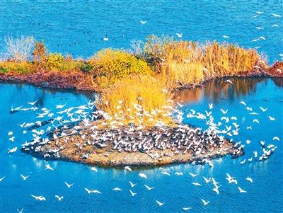 近日,江苏兴化里下河国家湿地公园内候鸟翔集,鸟儿在水面上自由地栖息、觅食。