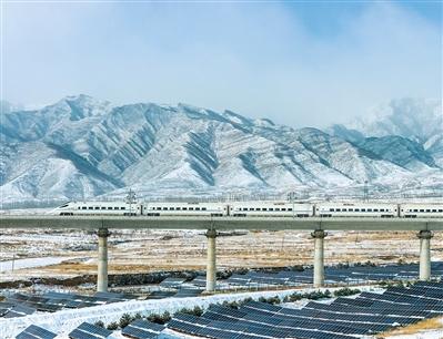 山西省忻州市代县境内,雪后的群山巍峨磅礴,一列复兴号列车在集大原高铁线上飞驰而过。