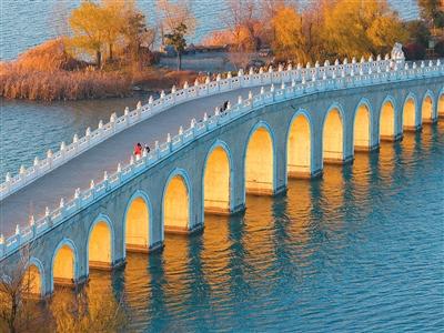 安徽省淮北市烈山区南湖国家湿地公园的十七孔桥近日出现“金光穿洞”景观,吸引众多游客前来观赏。