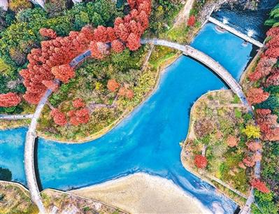 初冬时节,贵州省黔西市水西湿地河水清澈,岸边树木色彩斑斓,景色如画。