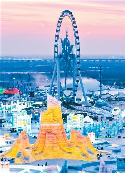 第二十七届哈尔滨冰雪大世界近日在黑龙江省哈尔滨市开园,为来自全国各地的游客打造一场兼具视觉震撼与深度体验的冰雪盛宴。图为傍晚时分的园区风光。