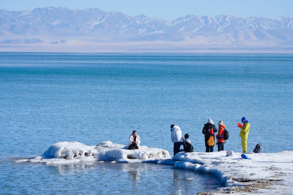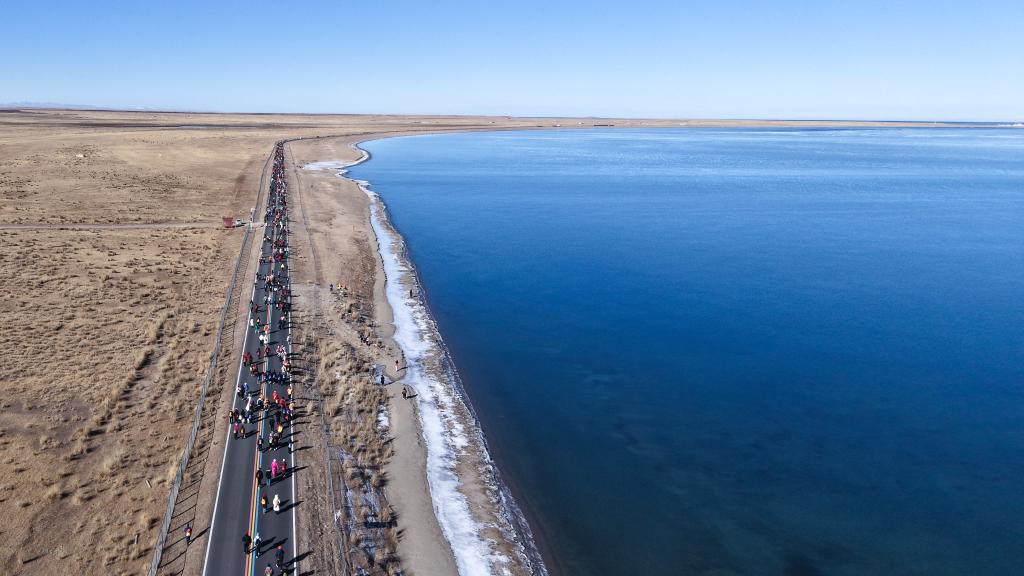 当日,青海湖迎新年生态环保徒步活动在青海省海南藏族自治州青海湖二郎剑景区举行。