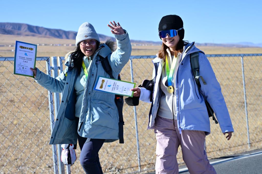 12月27日,两名徒步爱好者在抵达终点后。新华社记者 齐芷玥 摄