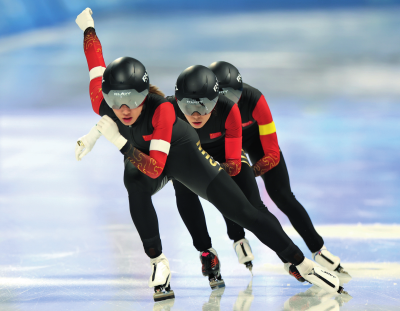 中国队选手杨滨瑜、阿合娜尔·阿达克、韩梅(从左到右)在哈尔滨举办的第九届亚冬会速度滑冰女子团体追逐决赛比赛中(2025年2月11日摄) 王楷焱摄/本刊
