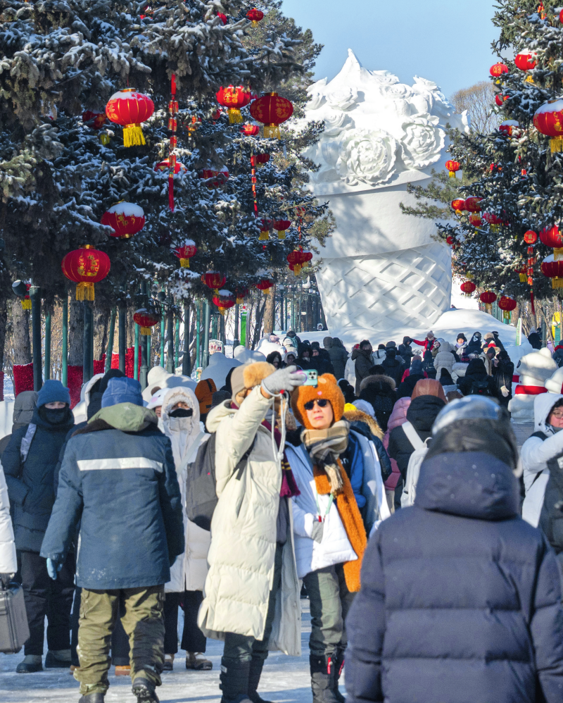 游客在第38届太阳岛国际雪雕艺术博览会园区游览(2025年12月27日摄) 张涛摄/本刊