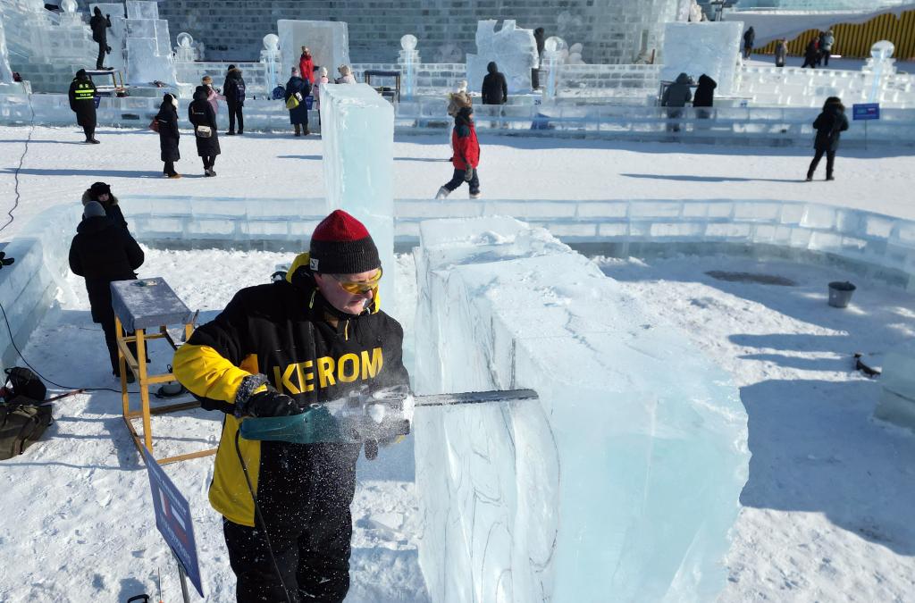 1月2日,冰雕师在哈尔滨冰雪大世界园区内进行冰雕创作。新华社发(刘洋 摄)