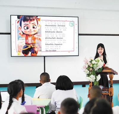 在泰国一所学校,教师使用中文智慧教学系统进行授课。