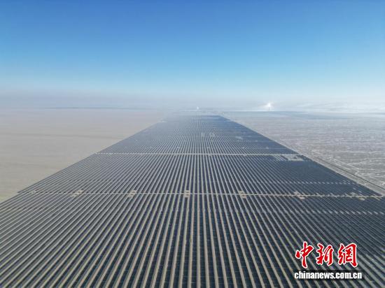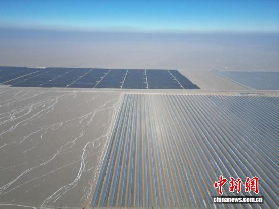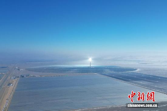 1月8日,航拍甘肃省敦煌市光伏基地与熔盐塔式光热电站同框。据悉,2025年1月1日至12月31日,甘肃省敦煌市首次实现了全年全域用“绿电”。“绿电”是指在生产过程中二氧化碳排放量为零或趋近于零的电力,其主要来源为太阳能、风力等可再生能源。位于河西走廊戈壁深处的敦煌,风、光资源丰富,光电可开发量达8600万千瓦。目前,敦煌市电源总装机容量达到434万千瓦,全部为风、光、水等可再生能源。(无人机照片)