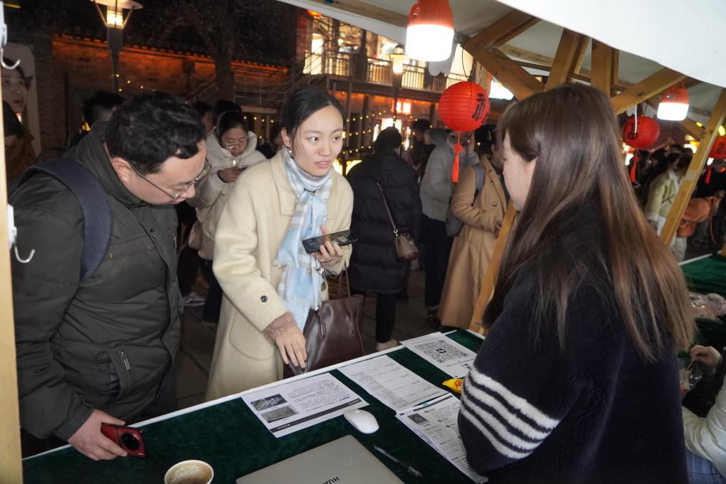 1月9日,南京老门东景区“人才夜市”现场,工作人员向求职者介绍相关政策。(刘臻睿 摄)