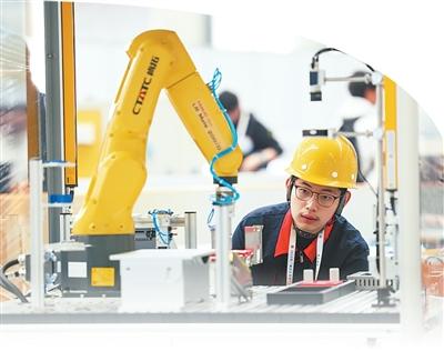 湖北省第三届技工院校学生技能大赛暨第四届教师职业能力大赛现场,选手参加机器人系统集成项目比赛。
