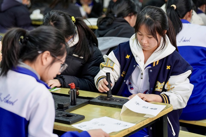 学生在西夏陵体验木活字印刷西夏文。新华社记者杨植森 摄