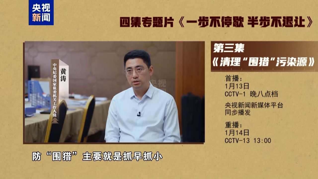 电视专题片《一步不停歇 半步不退让》第三集《清理“围猎”污染源》,讲述纪检监察机关坚决贯彻落实党中央决策部署,针对“围猎”乱象强化全链条惩治,从源头着力、向治本深化,多措并举,破除“围猎”与甘于被“围猎”的利益链,推动实现腐败问题的标本兼治。总台央视综合频道1月13日晚8点档播出,央视新闻新媒体平台同步播发。
