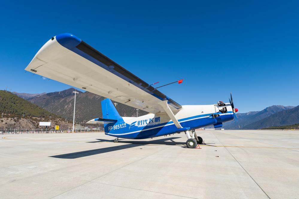 执行川藏高原跨区域无人机物流航线首飞的FP-985“金牛座”大型固定翼无人机。(新华社发)