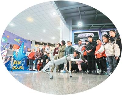 在浙江省嘉兴市科技馆,小朋友在“新质生产力·未来新引擎”科普主题展上与人形机器人和机器狗互动。