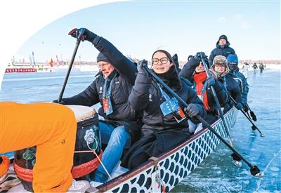 外国嘉宾在松花江冰雪嘉年华体验“冰上龙舟”冬季户外活动。