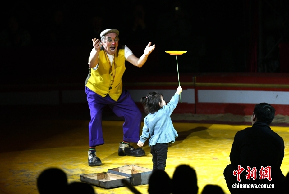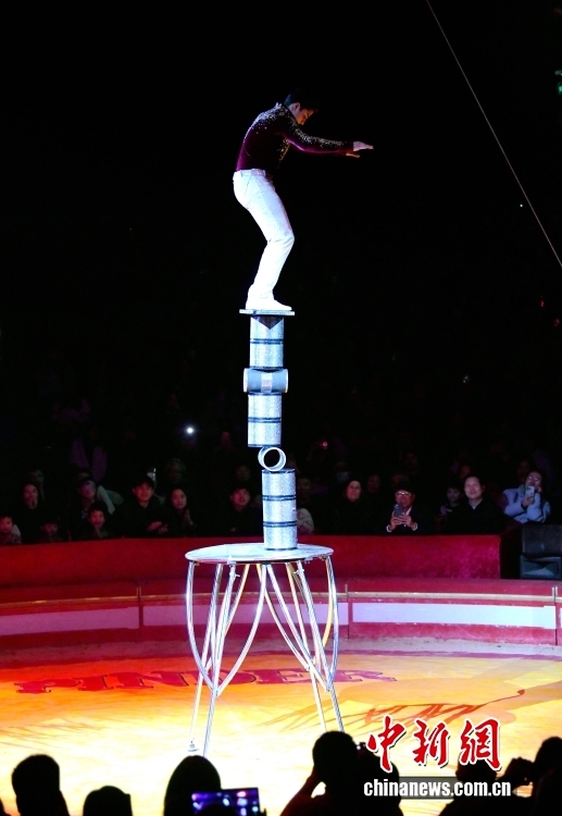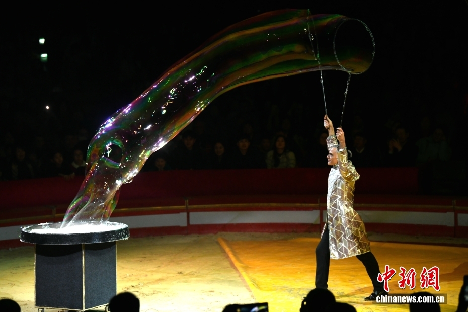 当地时间1月17日晚,庆祝中法建交62周年“杂技之夜”活动在巴黎举行。图为法国Pinder大马戏团杂技演员表演“魔术泡泡”。