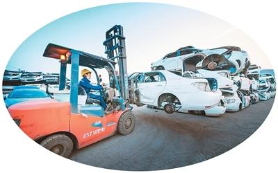 日前,中国资源循环集团有限公司旗下链金萍乡公司的员工正在装运报废汽车。