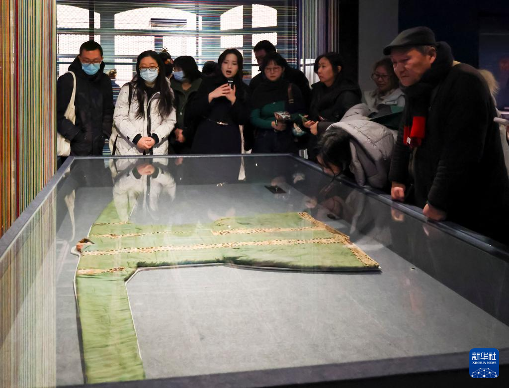 1月20日,观众在展览上观看北宋时期的缂丝饰边绿绢长袍。新华社记者 王翔 摄