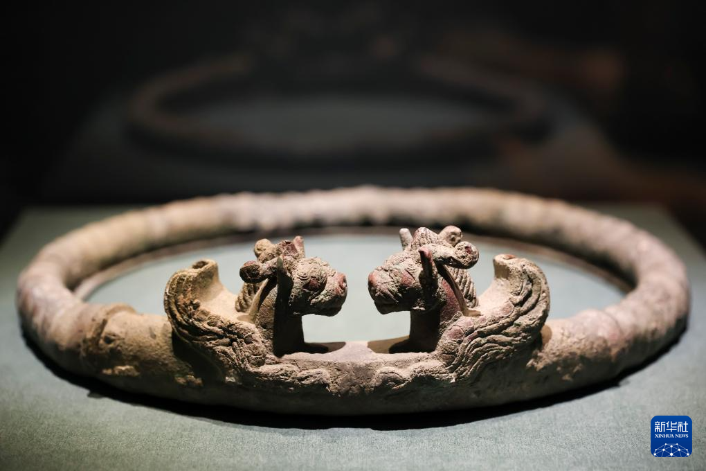 这是1月20日在展览上拍摄的战国时期的翼兽对视铜环。新华社记者 王翔 摄