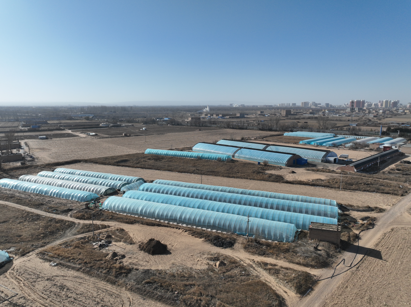 1月19日航拍定边县定边街道十里沙村的蔬菜大棚。李德龙(摄)