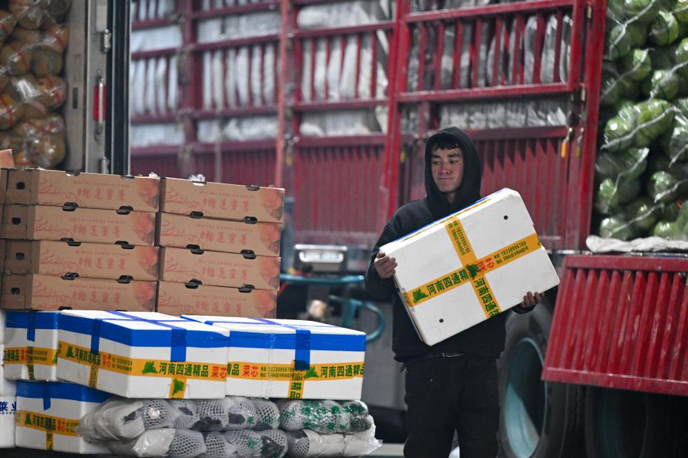 在新疆乌鲁木齐市九鼎农产品批发市场蔬菜交易中心,商户在搬运内地运来的新鲜蔬菜(1月19日摄)。
