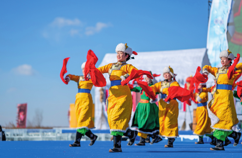 哈素海第四届冬捕节暨冰雪旅游系列活动在内蒙古呼和浩特市土默特左旗开幕。这是开幕式上的文艺表演(2026年1月10日摄)。连振摄/本刊