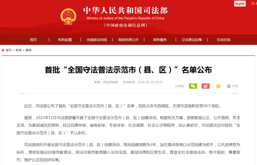 据悉,2022年11月司法部部署开展了全国守法普法示范市(县、区)创建活动。根据有关方案,按照客观公正、公开透明、务求实效、为基层减负的原则,经过自愿申报、省级初审、专家评审、社会调查、社会公示等程序,经认真研究,司法部决定对首批“全国守法普法示范市(县、区)”予以命名。