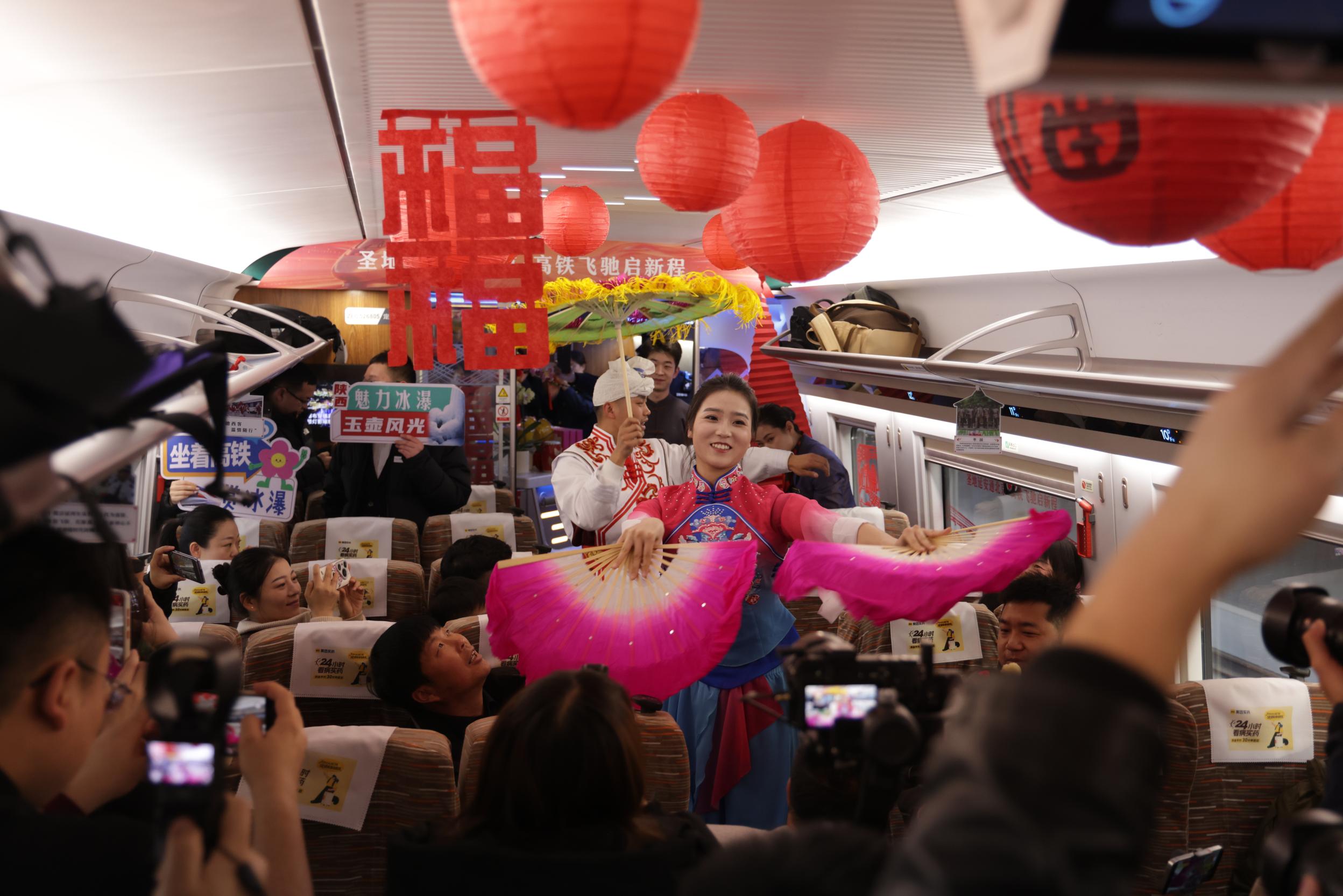 延安至北京首发列车被精心打造成“流动的文化长廊”。车厢内,陕旅集团“金延安”演员上演情景剧《高铁赴延》,新时代青年与“老延安”展开跨越时空的对话;延安革命纪念馆讲解员动情讲述《南泥湾的耕耘》;安塞腰鼓非遗传承人高塞东带领团队在车厢中击鼓起舞,鼓声铿锵仿佛在诉说黄土高原的千年回响。