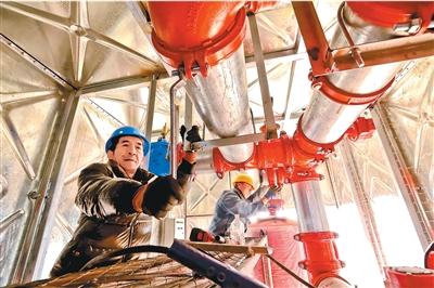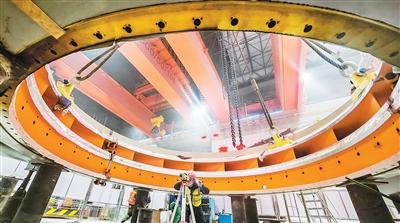 图为在国网新源新疆哈密抽水蓄能电站建设现场,测量员在引导组装调试一号机组蜗壳。