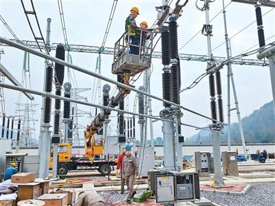 图为南方电网贵州铜仁供电局工作人员在升降车上调试新设备,确保500千伏铜仁西变电站如期投入运行。