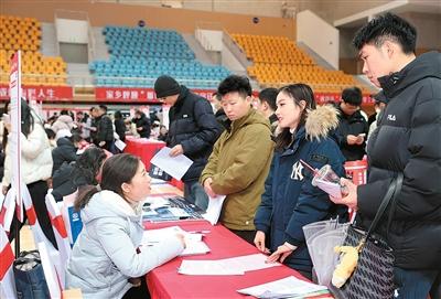 在江苏省宿迁市宿城区举行的2026年首场招聘会上,应聘者了解用人单位和招聘岗位信息。