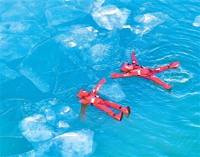 身穿全包裹防寒服,在专业教练指导下,躺卧在不冻水域上享受惬意时光——近来,冰浮项目在内蒙古、宁夏等北方地区兴起,成为冰雪旅游市场备受欢迎的新玩法。图为游客在宁夏银川阅海国家湿地公园体验冰浮项目。