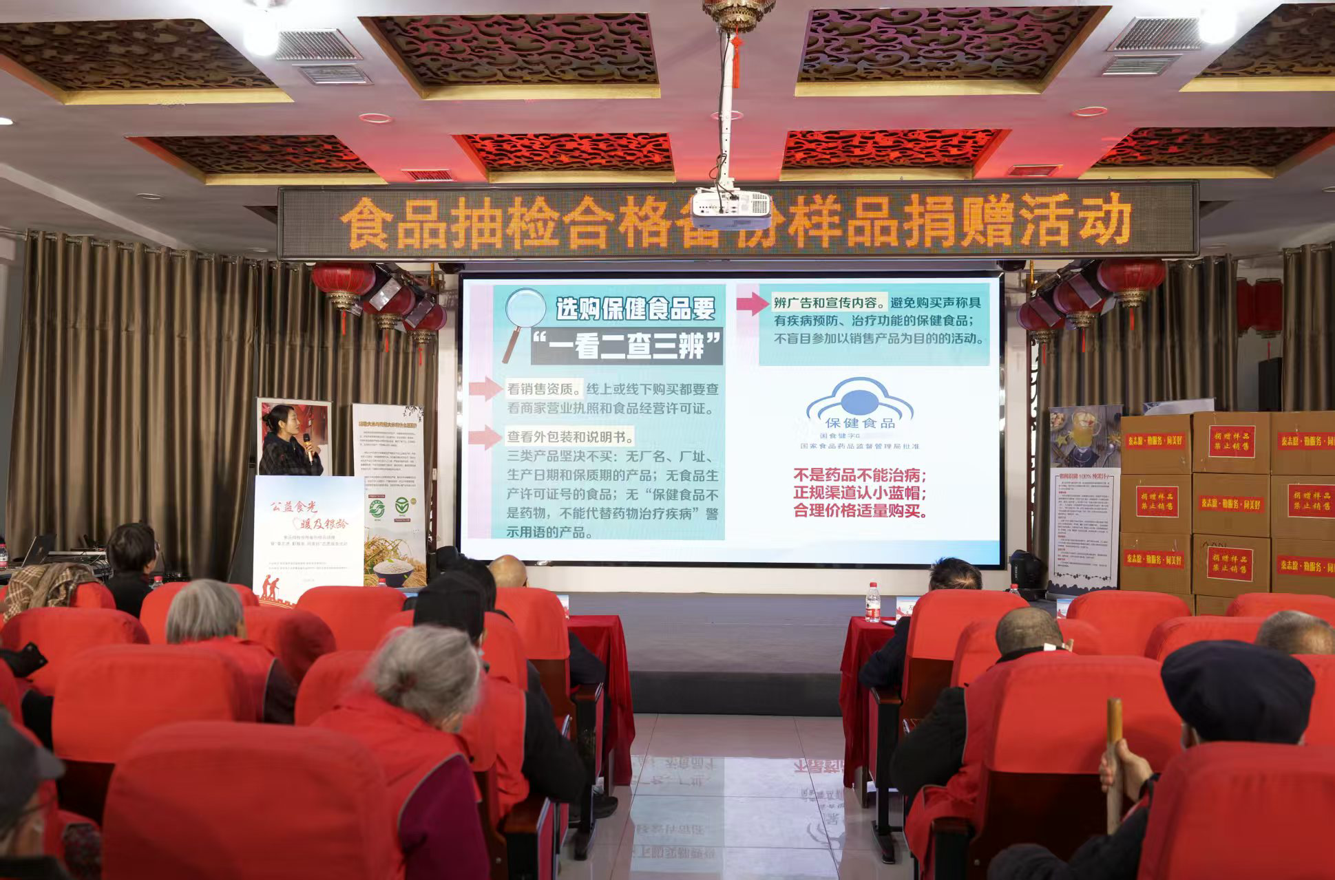 随后,来自省产品质量监督检验研究院、咸阳市食品药品检验检测中心、省市场监管局稽查局的三位专家分别围绕保健食品基本知识及老年人日常饮食注意事项、防范电信诈骗、防范非法集资等内容,结合实际案例向现场观众进行了科普和宣讲。其间穿插趣味十足的有奖问答,老人们踊跃参与,现场气氛温馨热烈。