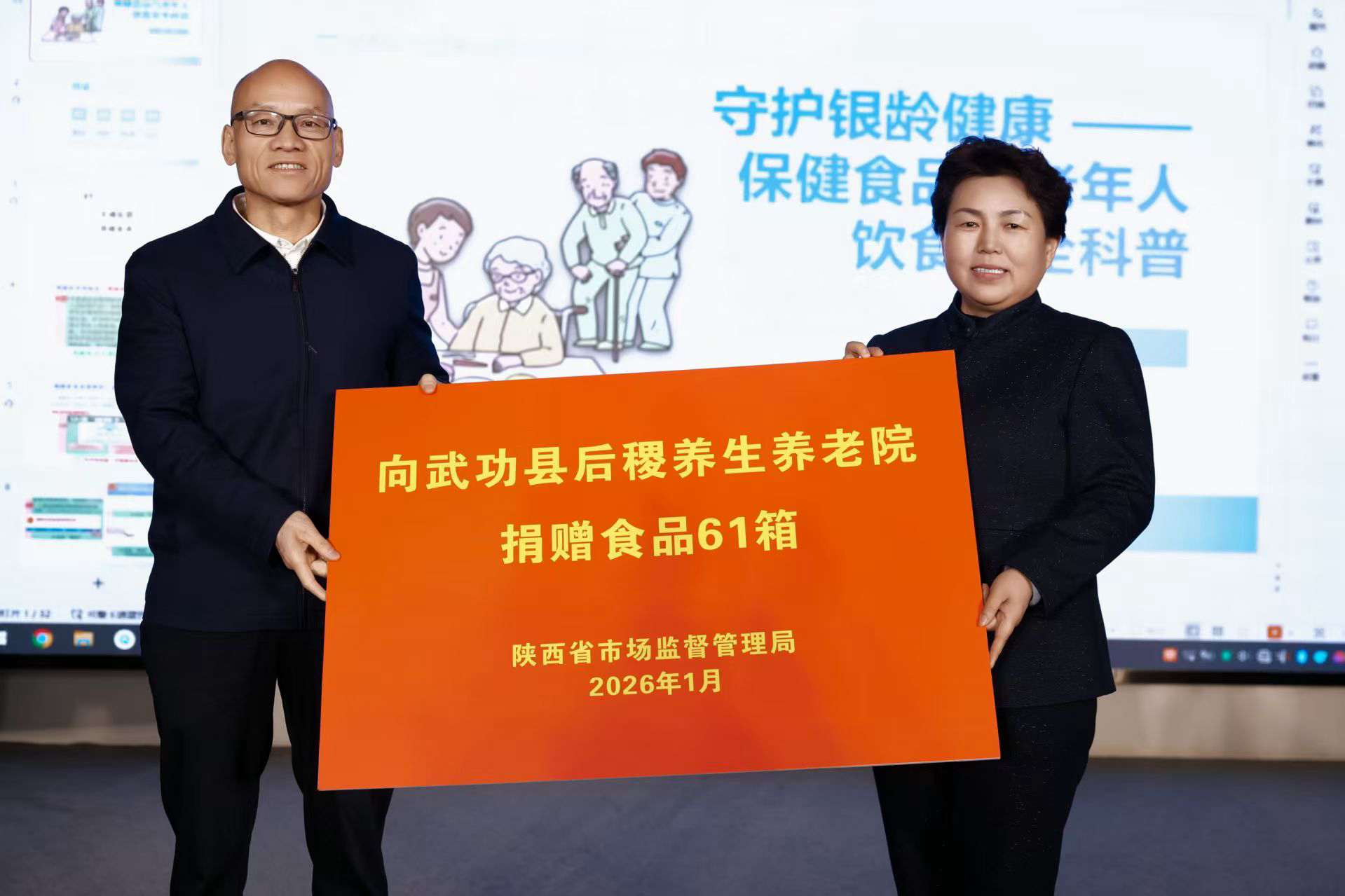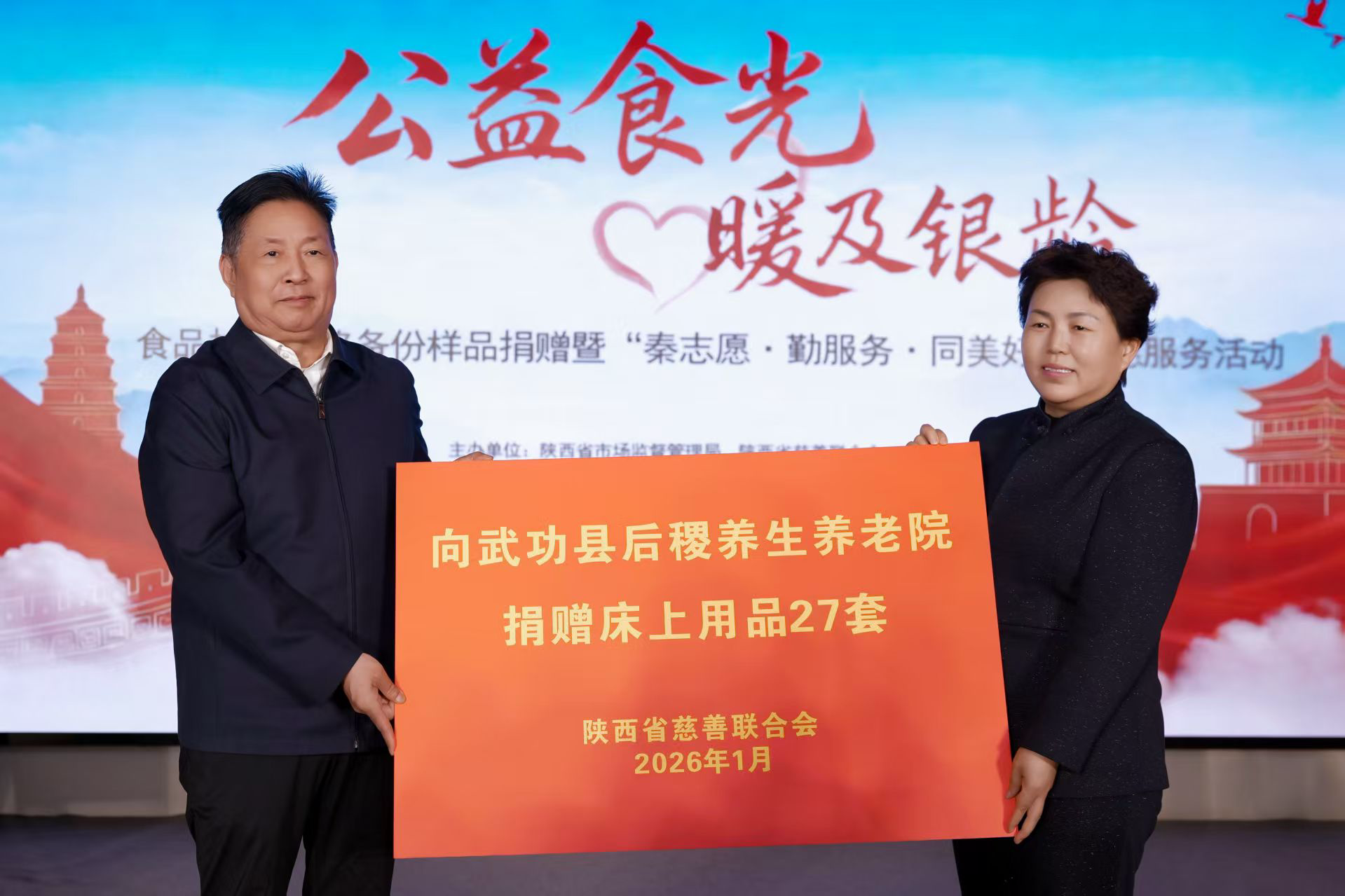 本报讯(实习记者 权子昂)为深入践行《中华人民共和国反食品浪费法》,推动食品抽检合格备份样品公益化再利用,以实际行动弘扬“奉献、友爱、互助、进步”的志愿精神,1月27日,陕西省市场监管局联合省慈善联合会,在咸阳市武功县举办“公益食光 暖及银龄”食品抽检合格备份样品捐赠暨“秦志愿·勤服务·同美好”志愿服务活动。